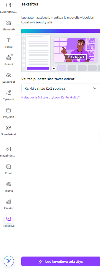 - Siirry vasemmalta valikosta ”Tekstitys”-työkaluun.